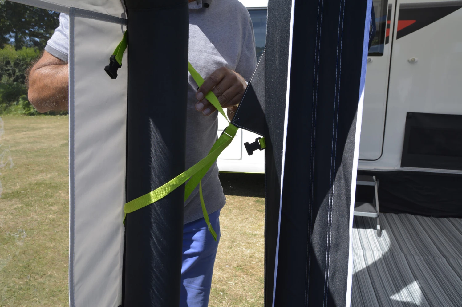 Utilizing the AirFrame system with single-point inflation, the Dometic All Season Air Break 3 is a durable and easy-to-set-up windbreak. Its striking color combination and use of Weathershield Pro or All-Season material make it the perfect complement to Dometic awnings. The windbreak can also be connected to the front of the awning for a fully enclosed area, ideal for keeping dogs contained. With a window panel for visibility and the ability to attach multiple panels and door panels, this windbreak has been updated to be 680cm long, providing even greater coverage.