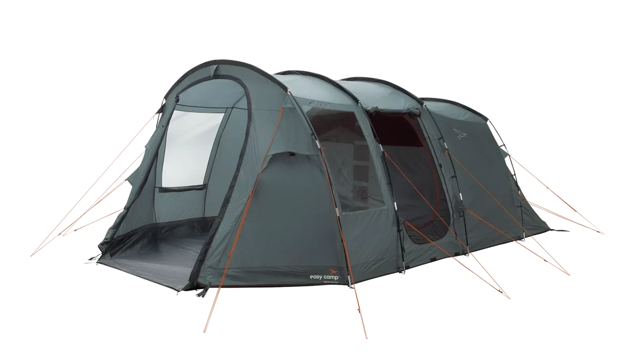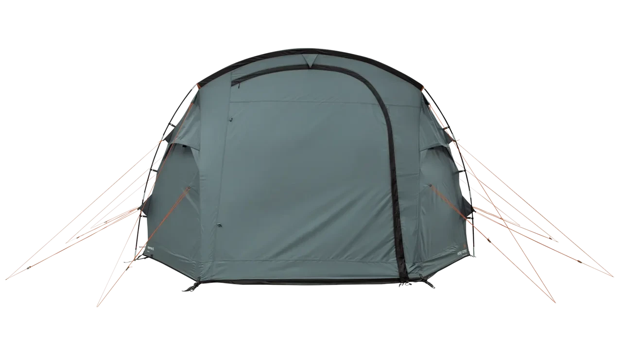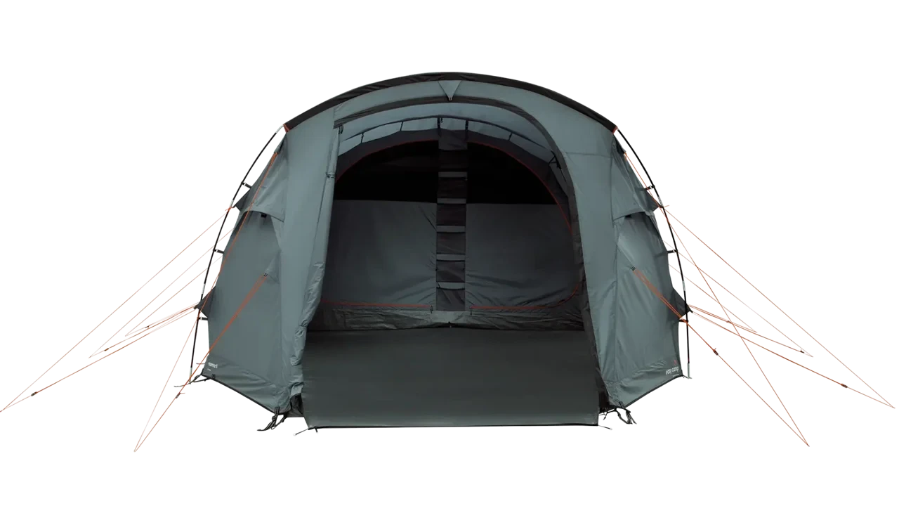 The Easy Camp Hamra 5 Tent boasts ample room and a sloping front to optimize living space. It has a sewn-in groundsheet to prevent drafts and insects, as well as a spacious side entrance with a fully ventilated mesh door. The tent also includes a SleepTight inner tent for a comfortable night’s sleep. For added ventilation, the tent features a side window with a curtain and front mesh panels. The living area provides standing height and removable divided bedrooms for privacy, along with convenient organizer pockets. Plus, with mains access and adjustable rear ventilation, the Hamra 5 Tent is the ultimate camping companion.