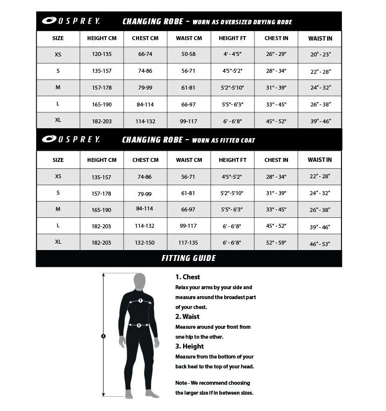 The new Osprey Changing Waterproof Long Sleeve Changing Robe is the ultimate outdoor changing robe. The waterproof outer shell keeps the wind and rain away while the fleece lining keeps you warm. Ideal for all outdoor and water sport and beach going activities. The towel has been designed from quality materials that will stand the test of time, are lighter than they appear and super soft. These robes provide insulation and warmth while you change or are just chilling in between sessions.