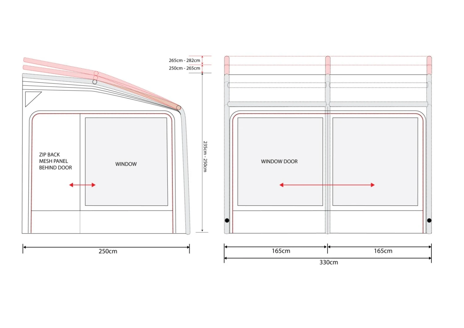 Featured on the Sport Pro 260, the ‘Multi Height Roof System’ makes the 2025 range of Pro awnings our most versitile range of awnings yet: each with an adjustable roof height range of 235-250cm / 250-265cm / 265-282cm to fit Caravans & Motorhomes up to 282cm high.