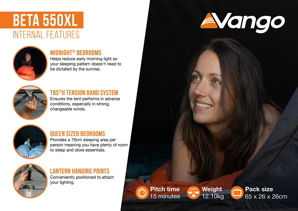 The Vango Beta 550XL tent is designed with the needs of 5 campers in mind. With 3 poles and a tunnel structure, it offers an ample sleeping area and a practical porch for storing camping essentials. Made with robust Sentinel Fabric that boasts a 4,000mm HH rating and ColourLok Eco technology, this tent is sure to retain its color for years to come. Its Dynamic Weave 100â„¢ Fabric helps keep the overall weight and size of the tent low, without compromising on Vango’s signature quality and durability. Additionally, the midnight bedrooms promote a better night’s sleep, and the Easy-Pack Carry Bag makes packing up after your camping adventure a breeze. Whether for a slightly longer trip or a comfortable weekend getaway, the Beta 550XL is a top choice for campers looking for a spacious and reliable tent.