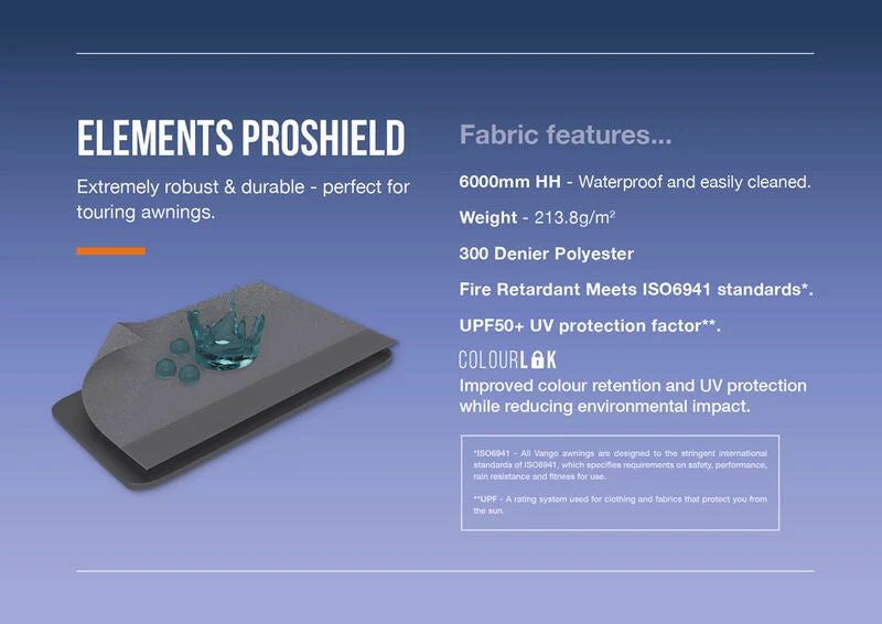 - Elements ProShield – Robust, durable and waterproof. 300D fabric with an HH rating of 6,000MM. Benefits from ColourLok™ technology to aid colour retention.