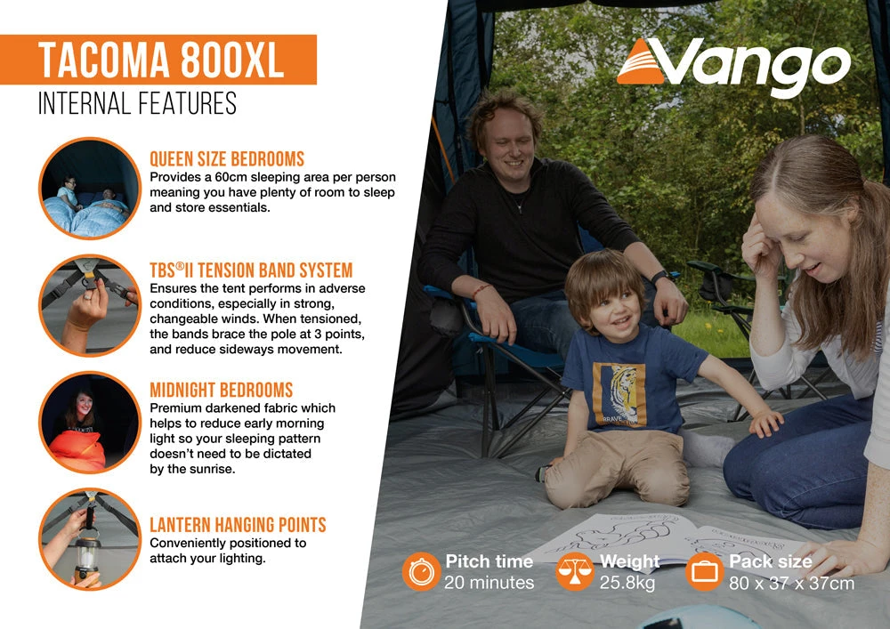 The Vango Tacoma 800XL is a Powerflex® Fibreglass pole 8-man tent with a vis-a-vis layout. Enhanced airflow and ventilation, including airflow vents, have been incorporated into the design. This tent is perfect for campers seeking private sleeping areas, as well as a roomy central living area. The living space is well-lit and airy during the day, thanks to large Diamond Clear windows that can be covered by roll-away toggled curtains at night. The use of Dynamic Weave 100â„¢ Fabric ensures a compact size and light weight, while maintaining Vango’s high standards for quality and durability. For added convenience, an optional side awning can serve as a useful porch for storing extra gear.
